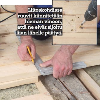 Aseta soirot paikoilleen ja oikaise ne laserin tai vesivaa’an mukaan. Kiinnitä ne sivusta palkkeihin 5 x 80 mm ruuveilla noin 40-50 cm:n välein.