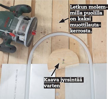 Jyrsi lattian keskellä oleviin kaar-rekohtiin ura lämpökaapeleille. Työstä pieni kaava, jota pitkin voit jyrsiä. Leikkaa seinustaa varten pieni muotti-laudanpätkä, jonka avulla saat ohjattua kaapelin edellisestä urasta seuraavaan.
