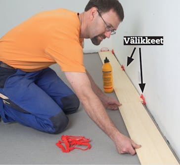 Aloita asennus kulmasta ja etene vasemmalta oikealle. Lattialaudat asennetaan pontit eteenpäin ja niitä tuetaan kiiloilla tai välikkeillä, jotta seinää vasten jää noin 8 mm rakoa.