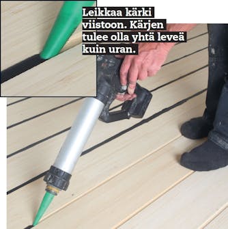 Pursota saumamassaa pari riviä kerrallaan. Hyvästä saumapistoolista on tässä työssä iso etu. Varmista, että ura täyttyy saumamassasta kokonaan -pursota massaa mieluummin liikaa kuin liian vähän.