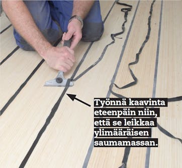 Poista ylimääräinen sauma-massa, kun se on 1-2 päivän päästä kovettunut. Käytä työhön kaavinta. Varo, ettet tee bambulattiaan lovea. VINKKI: Hieman kulunutta kaapimen terää on helpompi ohjata kuin täysin uutta.