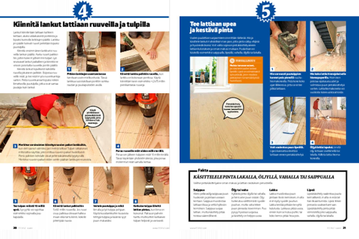 Lankut kiinnitetään lattiaan kahteen kertaan, aluksi väliaikaisesti ponteista ja lopuksi kunnolla lankkujen päältä. Lankkujen päälle tulevat ruuvit peitetään lopuksi puutulpilla.