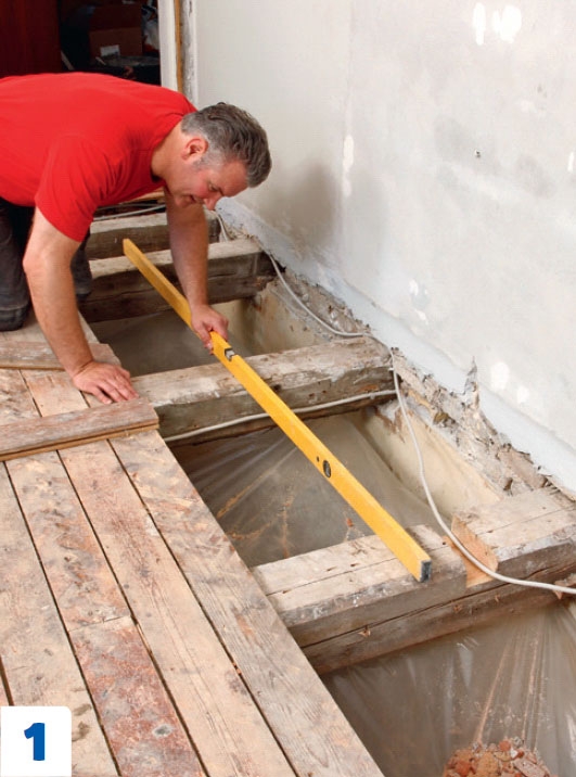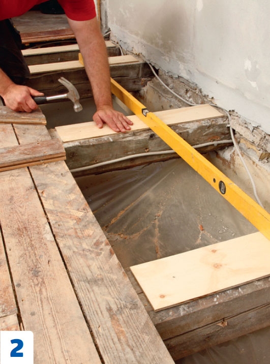 Suora ja luja alusta on hyvän puulattian perus edellytys. Ellet halua höylätä vanhoja palkkeja, voit oikaista lattian korkeimman kohdan mukaan. Varmista, että ovet mahtuvat avautumaan. Lattian voi oikaista monella tapaa. Tässä käytetään vaneria ja pahvia.