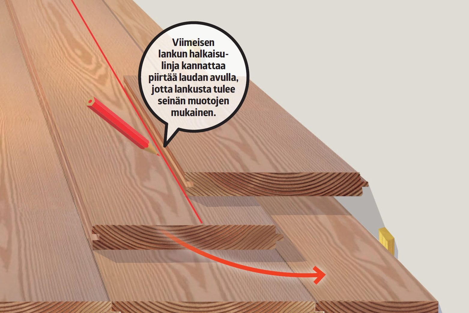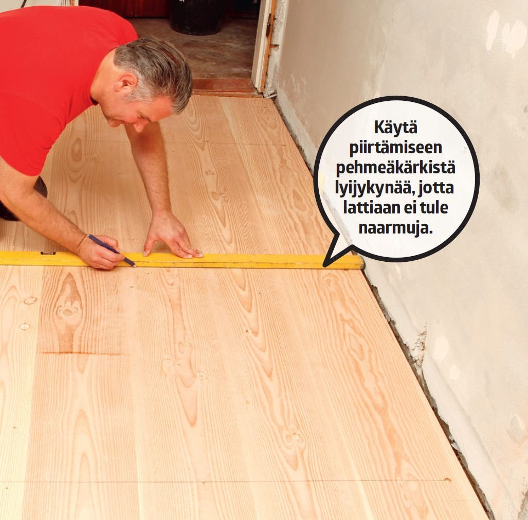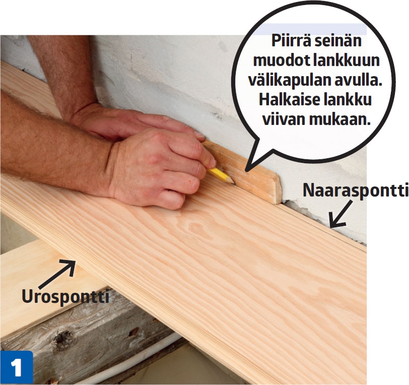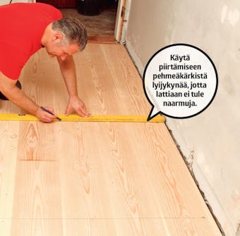 Aseta lankku seinän viereen naaraspontti edellä. Laske, kuinka leveä lankku toiselle puolelle huonetta tulee. Halkaise ensimmäinen lankku siten, että siitä ja viimeisestä lankusta tulee yhtä leveät.