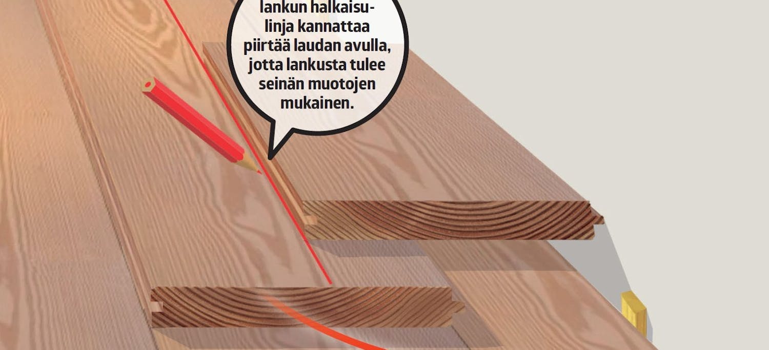 Ellei lankkujen leveys satu sopimaan huoneen leveyteen, reunimmaiset lankut kannattaa halkaista yhtä leveiksi. Laske aluksi, kuinka leveä viimeisestä lankusta tulee, jos lattian rakentaminen aloitetaan kokonaisella lankulla. Jos joudut halkaisemaan viimeisestä lankusta pois paria senttiä leveämmän kaistaleen, jaa viimeisen lankun leveys kahdella ja kavenna ensimmäistä lankkua sen verran. Siten kummankin seinän viereen jää vähintään puolikas lankku.
