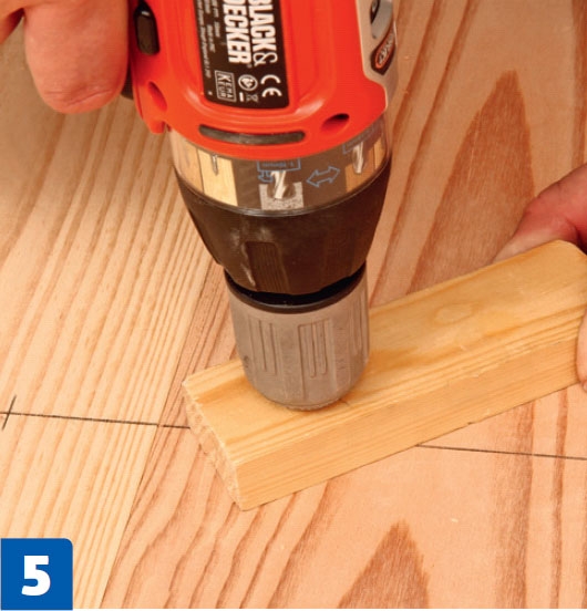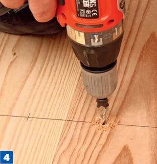 Poraa ruuveille reiät viiden millin terällä. Poraa sen jälkeen tulppien reiät 10 millin terällä. Tässä käytetään yhdistelmäterää, joka poraa molemmat reiät samalla kertaa.