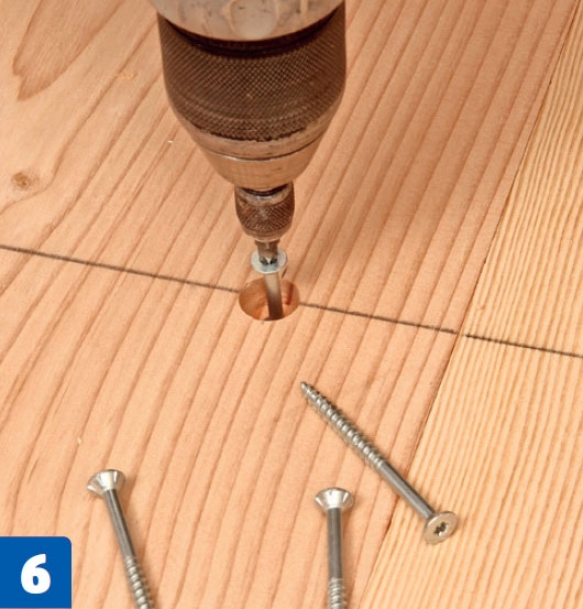 Kiinnitä lankut lopullisesti kahdella ruuvilla jokaiseen palkkiin. Esiporaa ruuveille reiät, ja tee reiät myös ruuvinkantoja varten. Peitä ruuvinkannat lopuksi reikiin liimattavilla puutulpilla, jotka ovat samaa puulajia kuin lankut.
