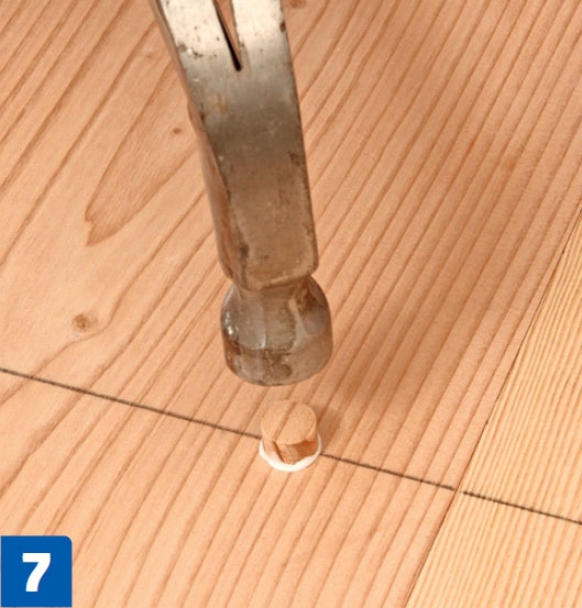 Voitele puutulppa ja reikä liimalla ja lyö tulppa pohjaan. Käytä kuusilankkuihin kuusesta tehtyjä tulppia ja käännä syyt puun mukaisiksi.