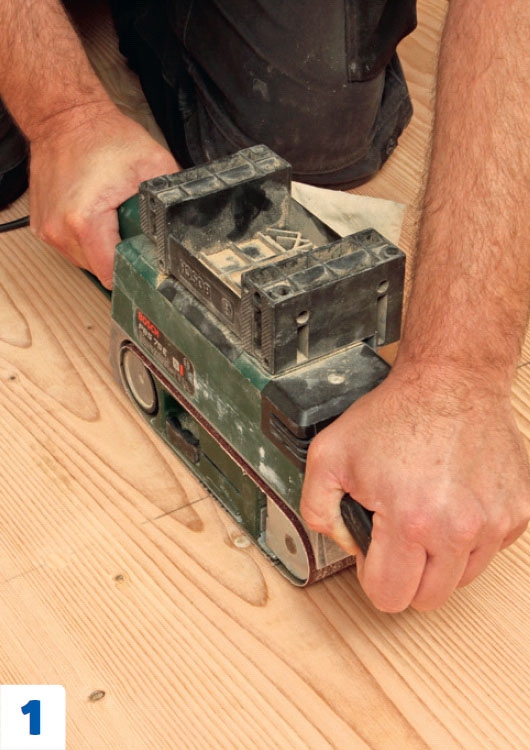 Hio varovasti puutulppien kannat pois pienellä nauhahiomakoneella. Pidä kone koko ajan liikkeessä, jotta se ei tee jälkiä lattiaan.