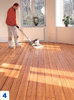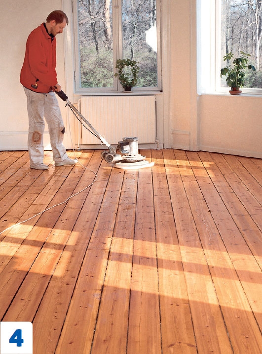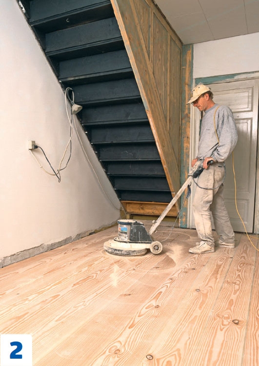 Hio koko lattia hienojakoisella hiomapaperilla. Hiominen poistaa epätasaisuudet ja valmistaa puun pintakäsittelyä varten. Lattiahiomakoneita voi vuokrata konevuokraamoista.