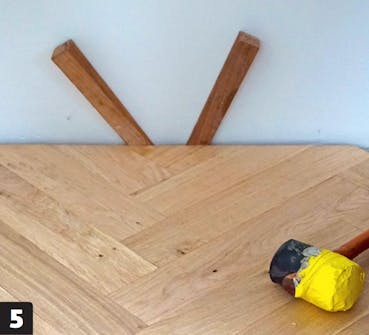 Aloita levittämällä liimaa 3-4 lautaan. Varmista, että laudat painuvat kunnolla kiinni toisiinsa ja ensimmäisen rivin lautoihin. Koputa laudat varovasti paikalleen vasaralla.