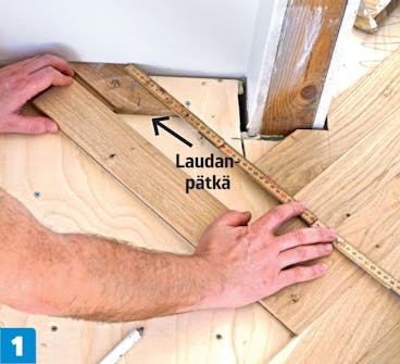 Aseta seinän viereen lyhyt laudanpätkä ja mittaa etäisyys sen päähän. Piirrä mitta lattialautaan ja sahaa se poikki. Muista vähentää mitasta 8-10 milliä, jotta lattia mahtuu elämään.