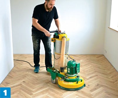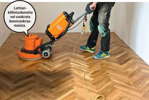 Hio lattia aluksi jyväkoon 60 hiomapaperilla, jotta lautojen väliset pykälät häviävät kokonaan. Ylitasoita lattia sen jälkeen valmis tasoitteella. Levitä seuraavaksi lattialle pohjustusöljyä 60 senttiä leveällä lastalla ja kiillota lattia. Kun suurin osa öljystä on poistet tu, kiillota lattia kiillotus koneella ja puuvillakankaalla.