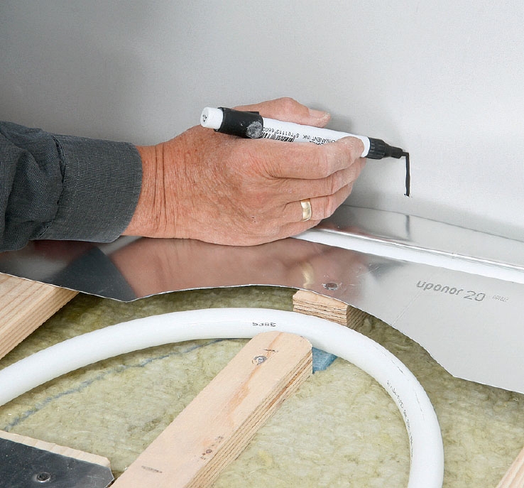 Aluslattian on oltava kunnollinen. Esimerkissämme koolaussoirot ovat kannattimien päällä. Lattia on eristetty, ja siihen on asennettu PEX-putkia. Laudat ovat poikittaisten koolaussoirojen päällä, jotta lämmönjakolevyt pysyvät paikallaan.