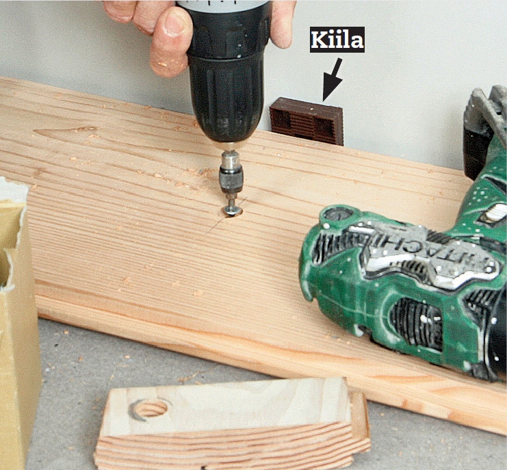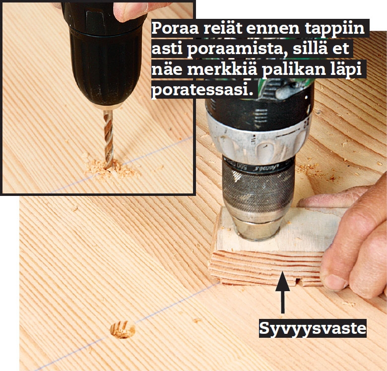 Poraa ruuvien reiät. Poraa ensin ohuemmalla poralla merkin kohdalta. Tee sen jälkeen lankunpätkästä syvyys-vaste, ja poraa sitten karmiporalla sen läpi reikä puutappia varten.