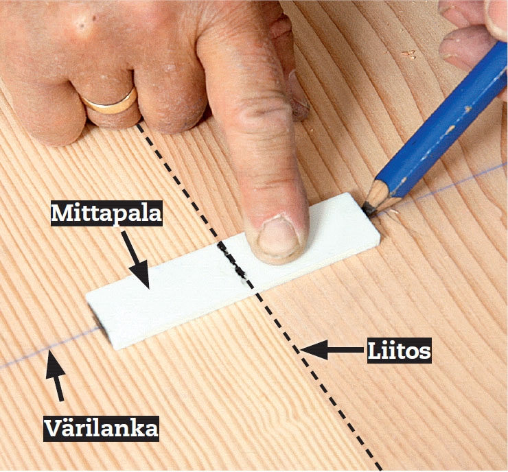 Tee ruuveja varten pieni mitta-tikku. Vedä viiva 5 cm pitkän palikan keskelle. Aseta tikku värilangan viivan päälle, niin että viiva on liitosta päin. Merkitse mittatikun päät. Ne kertovat tarkat ruuvien paikat.