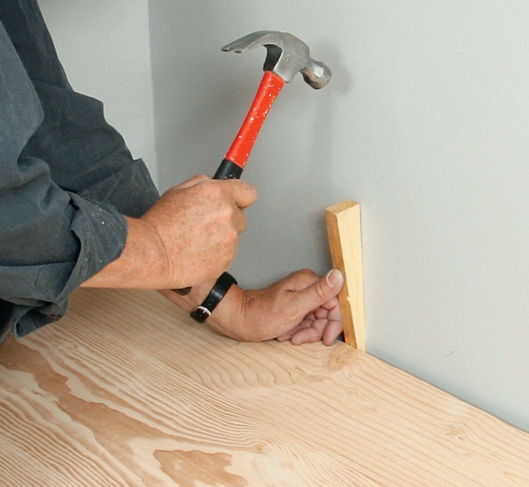 Jatka työskentelyä, kunnes etäisyys seinään on puoli metriä, ja paina lankut tiiviisti yhteen. Aseta seinää suojaava lauta huoneen molemmille puolille, jotta seinään ei tule jälkiä lautoja työntäessäsi.