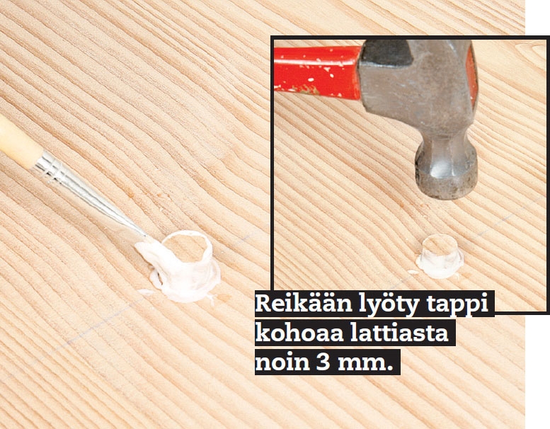 Kiinnitä tapit liimalla. Valitse tapit reikiin syiden ja värin mukaan. Sivele liimaa reikään pienellä jäykällä siveltimellä. Työnnä tappi reikään 1 mm:n syvyyteen, liimaa tapin sivut ja lyö tappi paikoilleen. Anna liiman kuivua vuorokauden ajan.