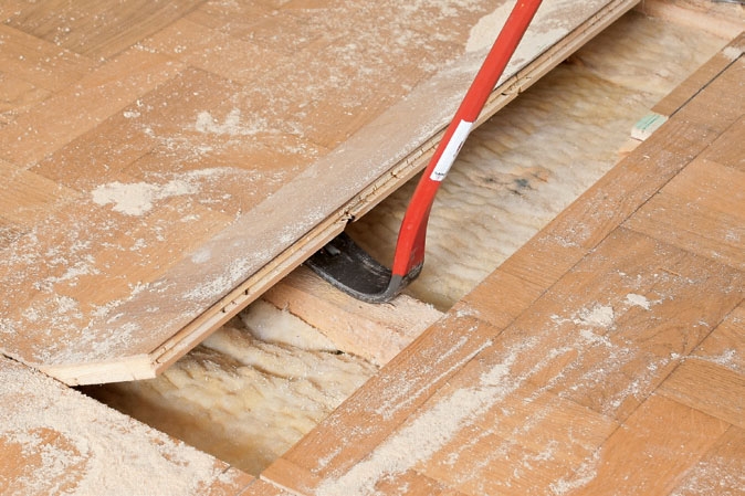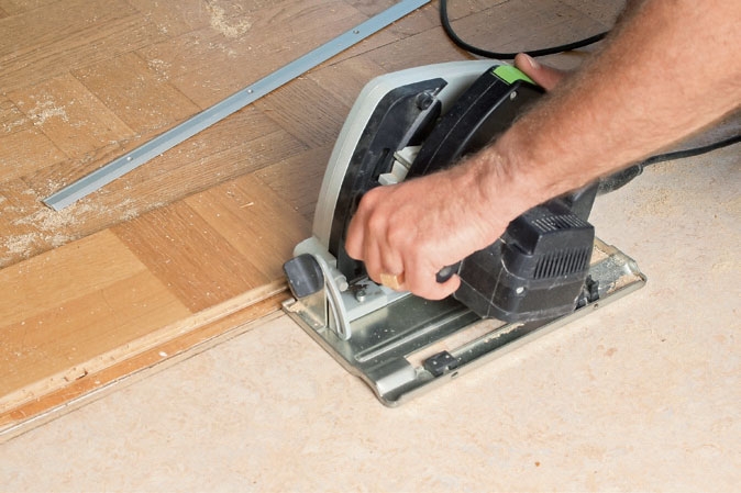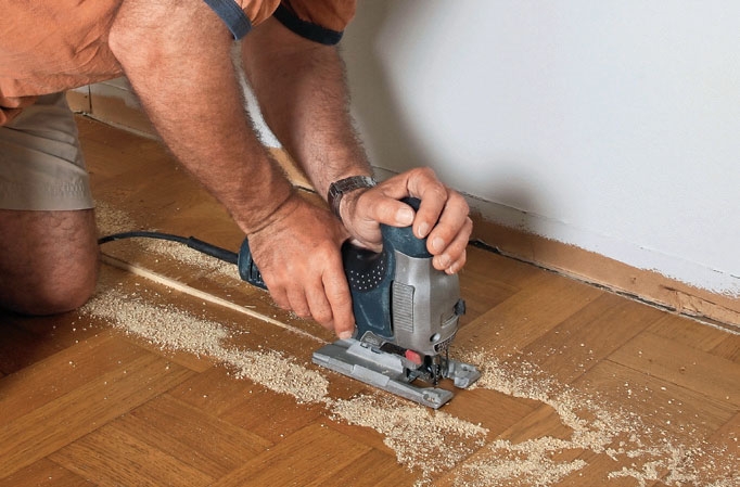 Vanha lattia sahataan pienempiin osiin. Voit käyttää pistosahaa, mutta varo, ettei pari senttimetriä lautojen alle yltävä sahanterä osu lautojen alla kannattimiin, putkiin tai johtoihin.