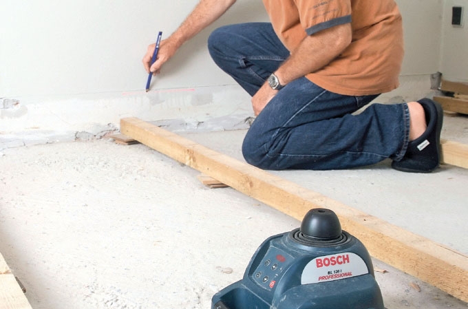 Tee seinälle merkki pyörivän laserin tai vanhan kunnon letkuvesivaa’an avulla. Työtä ohjaavat merkit voi esimerkiksi tehdä joka toisen kannattimen kohdalle 50 mm valmiin lattian pintaa ylemmäksi.