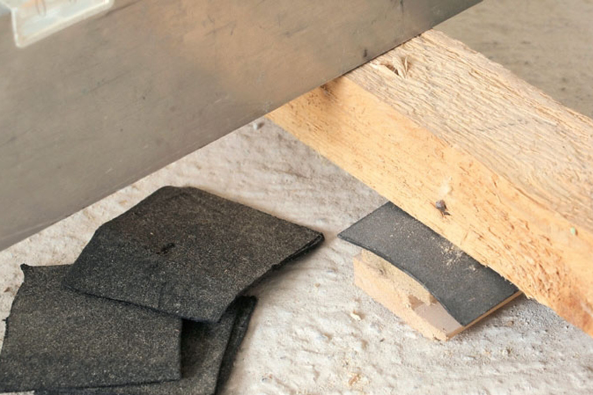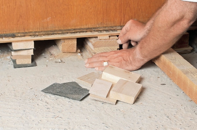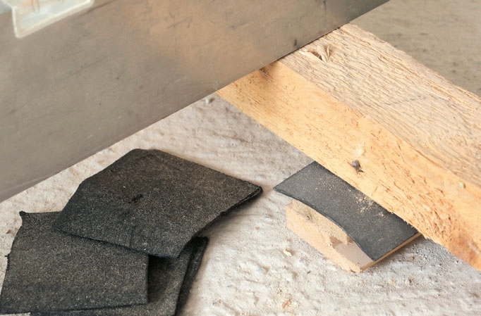 Tarkista kiilaus kynnyksen alla ja naapurihuoneen lattiarajassa, kun kiiloja ja bitumihuopaa nyt kerran on sopivasti käsillä. Aseta tarvittaessa lisäkiiloja, jotta saat ylimenokohdat hyvin tuettua.