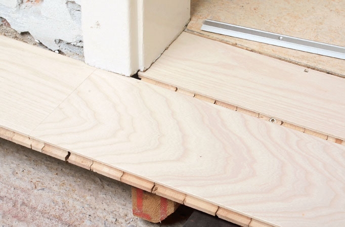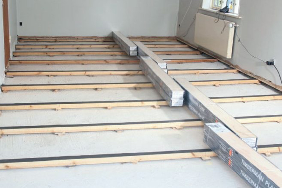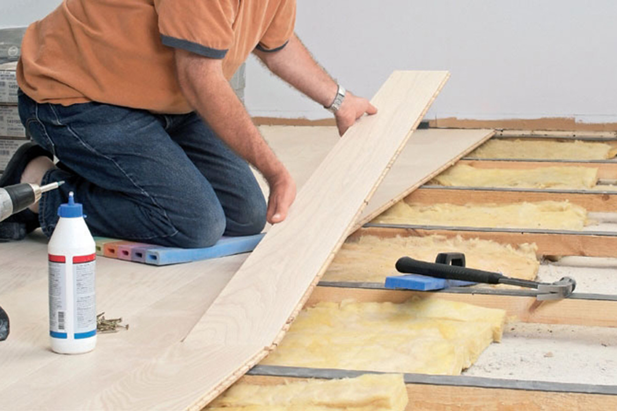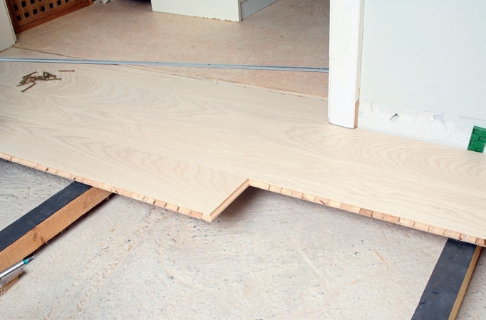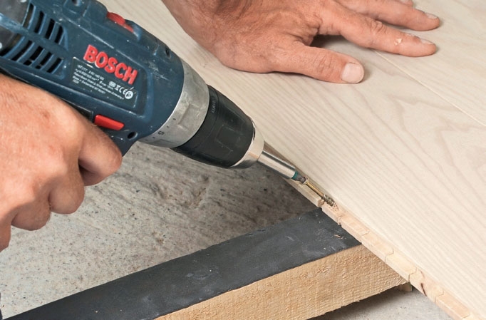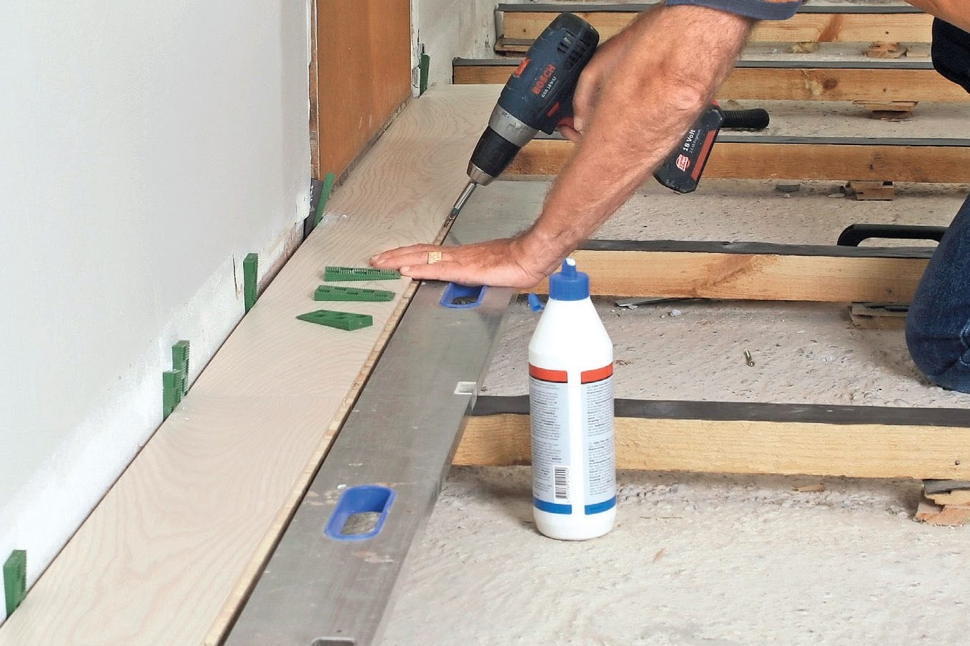 Uusi lattia tehdään kannattimien päälle: 182 cm pitkät parkettilaudat naputetaan yhteen ja kiinnitetään kannattimiin. Työ täytyy aloittaa oikein ja koko lattia-ala on mietittävä etukäteen, ennen kuin ensimmäinen rivi asennetaan. Tarkista, onko aloitusseinä päätyseinän kanssa samansuuntainen, ja jos joudut lyhentä-mään lautoja, sahaa niistä yhtä paljon kummankin sivuseinän puolelta.