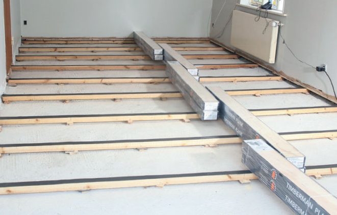 Kun työ etenee, päästään työsken-telemään uuden lattian päältä käsin. Paremman työergonomian ansiosta laudat on helpompi iskeä yhteen, eikä enää tarvitse hyppiä kannattimien ja eristeiden yli.