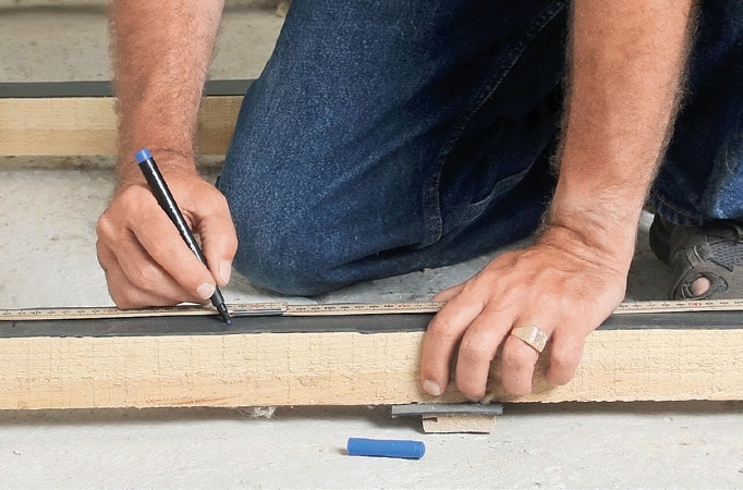 Aloita jokainen rivi pätkällä, joka sahattiin edellisen rivin lopuksi. Liitokset limitetään vähintään 30 cm rivistä riviin. Vältä liitosten osumista vierekkäisissä riveissä kahden saman kannattimen välille.