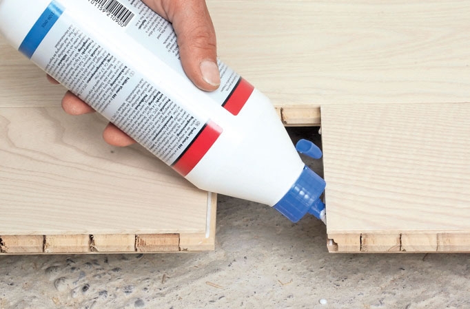Päätypontit liimataan PVAc-liimalla. Pitkiä sivuja ei sen sijaan liimata, sillä rivien pitää voida elää toisiinsa nähden. Purista pontin päälle ja uran pohjalle vana liimaa.