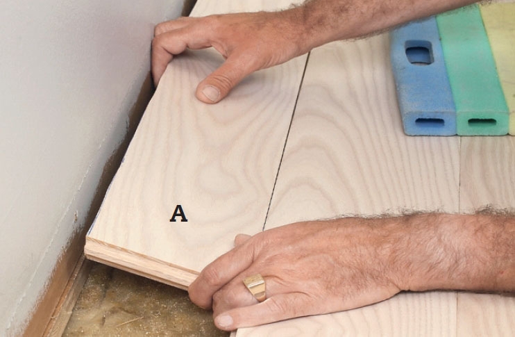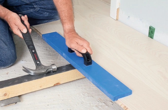 Lattialaudat isketään yhteen vasaralla ja leveällä muovisella lyöntikapu-lalla. Aloita vapaasta päästä ja työskentele itsestäsi taaksepäin päätyliitosta kohti. Näin lyhyet saumat puristuvat tiiviisti toisiinsa.