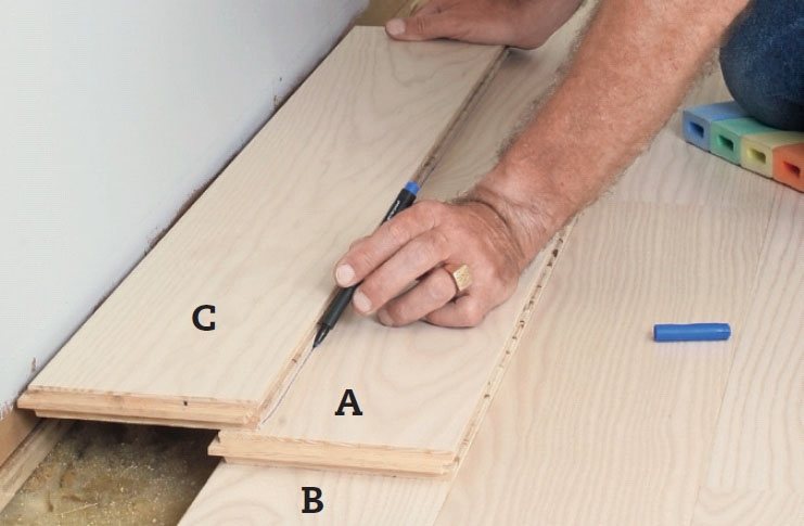 Merkitse viimeisen rivin lautaan (A) sahauslinja asettamalla lauta tarkasti toiseksi viimeisen rivin (B) laudan päälle ja piirtämällä linja kolmatta seinää vasten tuet-tua lautaa (C) pitkin. Jätä 5-10 mm:n rako.