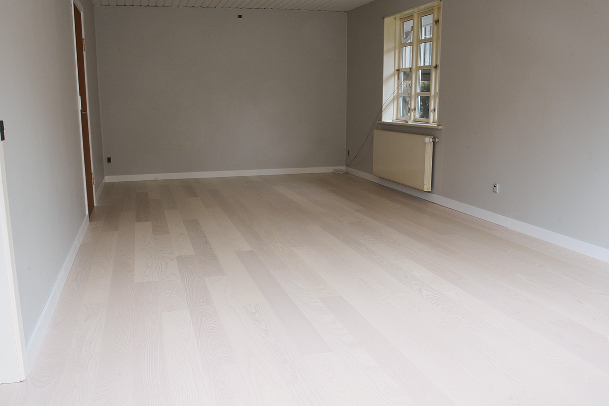 - Lattialautaa, tässä 22 x 145 x 1820 mm pontattu valkolakattu saarni