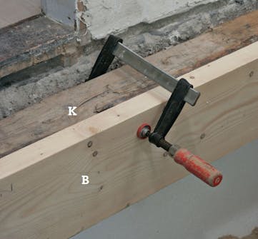 Kiinnitä tukilauta (B) uloimman lattiavasan sivulle huoneen toiselle sivulle parilla puristimella. Huoneen toisessa sivussa olevassa vasassa ei ole tilaa pu ris timille, joten kiinnitämme ensimmäisen tukilaudan toiseksi uloimpaan vasaan.