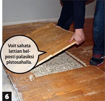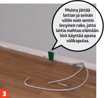 Nyt kannattaa pitää kieli keskellä suuta. Kaikki lankut pitää tukea samaan kor-keuteen ja yhtä ylös viereisen huoneen lattian kanssa.