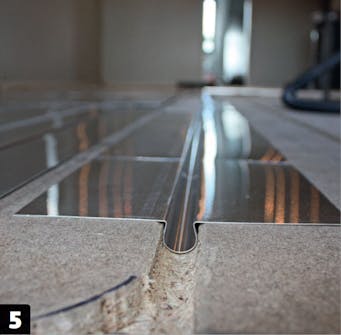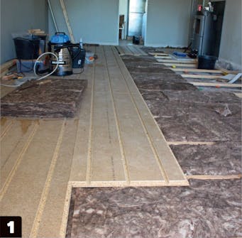 Saat lattiasta tukevan, kun ruuvaat uralevyt kiinni runkolankkuihin. Levyissä on paljon pitkittäisiä uria, jotka sopivat yhteen lämmönluovutuslevyjen kanssa. Joudut kuitenkin jyrsimään loivat urat lattialämmitysletkun mut-kien kohdalle.