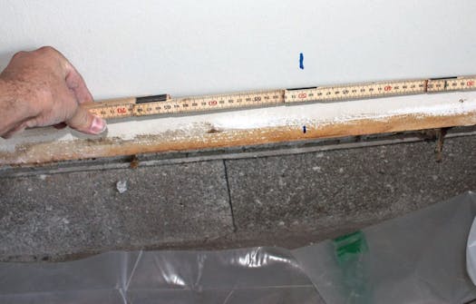 Purkaminen paljasti, että rakenteissa on isoja korkoeroja. Lankkujen toiseen päähän tarvittiin tueksi vain pari pientä muovikiilaa, mutta toiseen päähän tarvittiin lecaharkkoja.