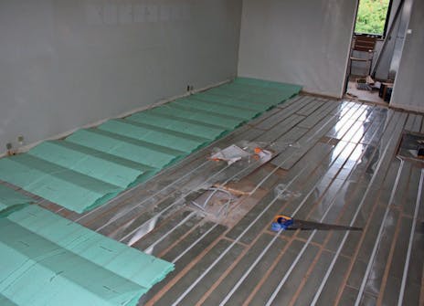 Levitä askelääniä vaimentava kerros lämmönluovutuslevyjen päälle. Askeläänieriste vaimentaa ääntä, joka syntyy, kun lattialaudat kopisevat metallisia lämmönluovutuslevyjä vasten.