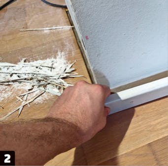 Tee tapettiin vaakasuora viilto jalkalistan päälle. Viilto estää tapettia repeämästä, kun lista irrotetaan seinästä.