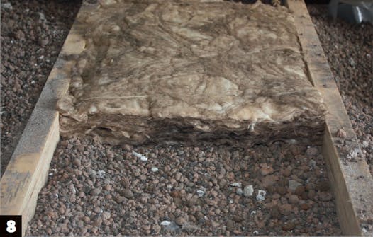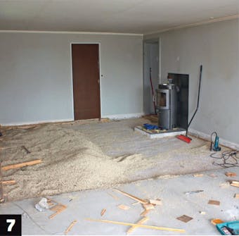 Poista vanhat eristeet. Tämä lattia oli eristetty korkin purulla. Lapioi vanhat eristeet jätesäkkeihin, jotta sotku ei leviä pitkin taloa.