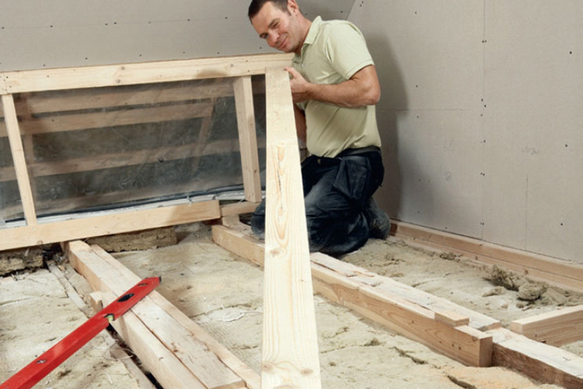 Päätä lattian korkeus. Jos sen pitää esim. olla samassa tasossa viereisen lattiapinnan kanssa, sahaa puukiilat, joiden korkeus vastaa levyjen ja valmiin lattia-pinnoitteen (esim. kaakelit) tasoa. Pitkällä vesivaa’alla näkee, tuleeko lattia tasoon.