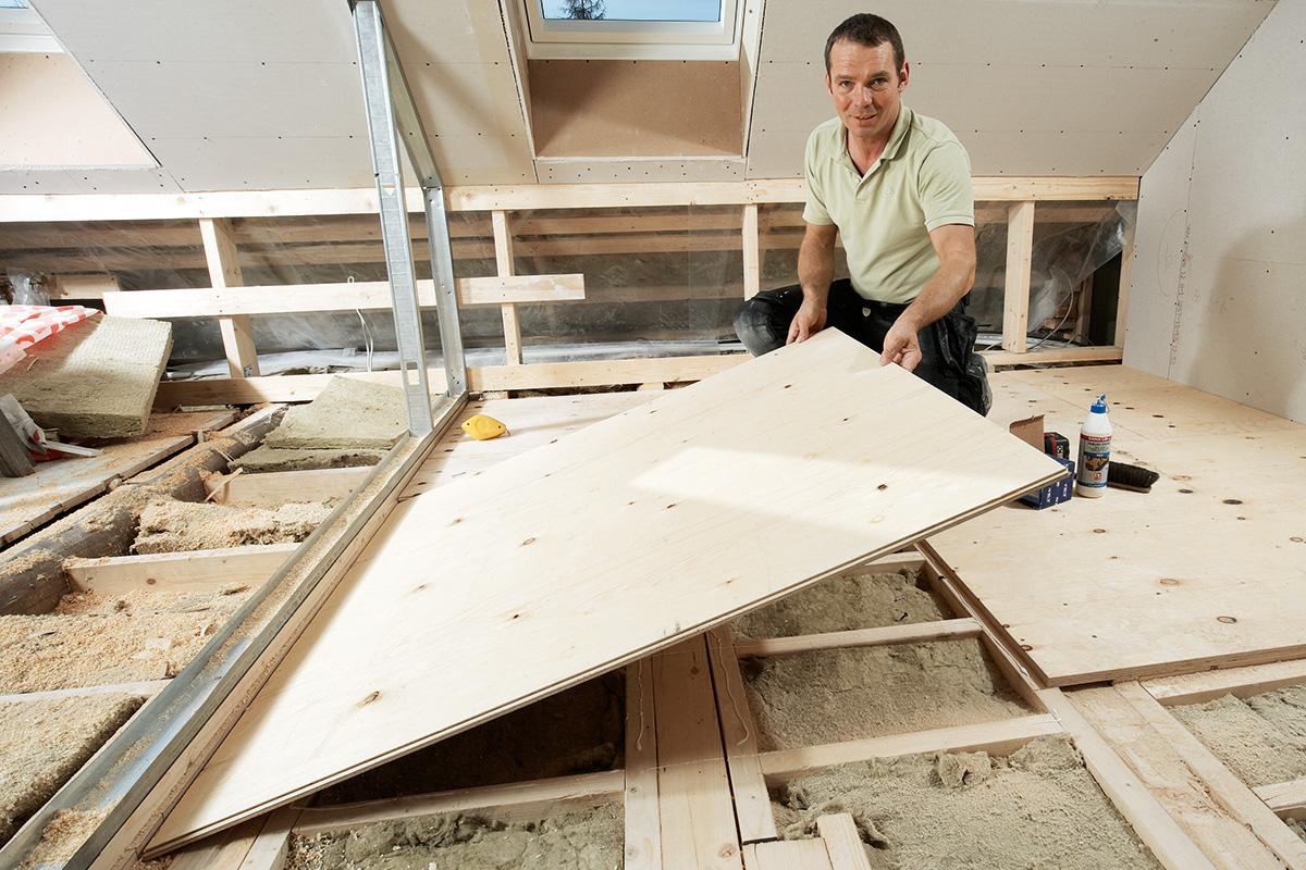 Vankan palkkiperustan ja lautojen päälle asennetaan 21 mm:n vanerilevyt. Liimaamme ja ruuvaamme levyt lautoihin ja palkkeihin. Mitä paremmin levyt saa-daan asennettua, sitä vakaampi lattiasta tulee, joten liimalla on merkitystä - ja mitä useampia ruuveja, sitä parempi. Jos aiot asentaa märkätilalevyt vanerilevy-jen päälle kuten tässä tehdään, kiinnitä levyt harkitusti, jotta et vahingossa osu alla oleviin ruuveihin.
