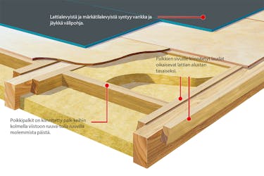 Sivele alustalle liimaa. Sivele liimaa myös lautoihin ja palkkeihin, jotta lattialevyt asettuvat vakaasti.