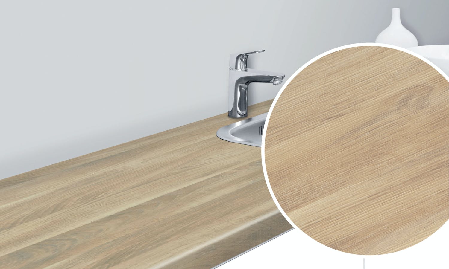 Saksalaisyritys Resopal on tehnyt huolellis-ta työtä luodessaan laminaattiinsa saman värimaailman ja syykuvioinnin kuin aidossa puussa. Materiaali ei myöskään tunnu tai näytä muoviselta, vaan muistuttaa paljon aitoa öljyttyä tammipintaa. Hämmästyim-me, miten aidolta pinta näytti.