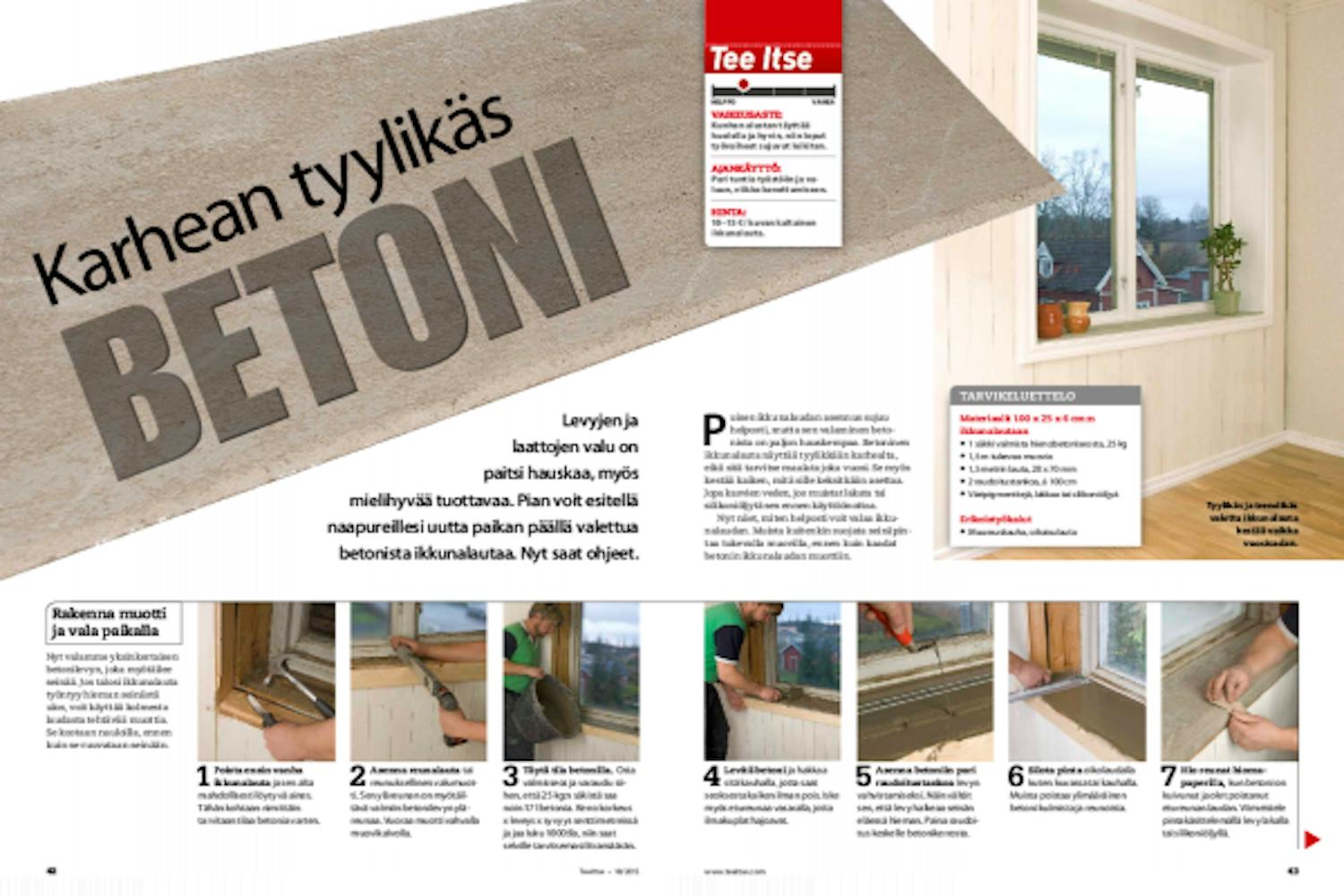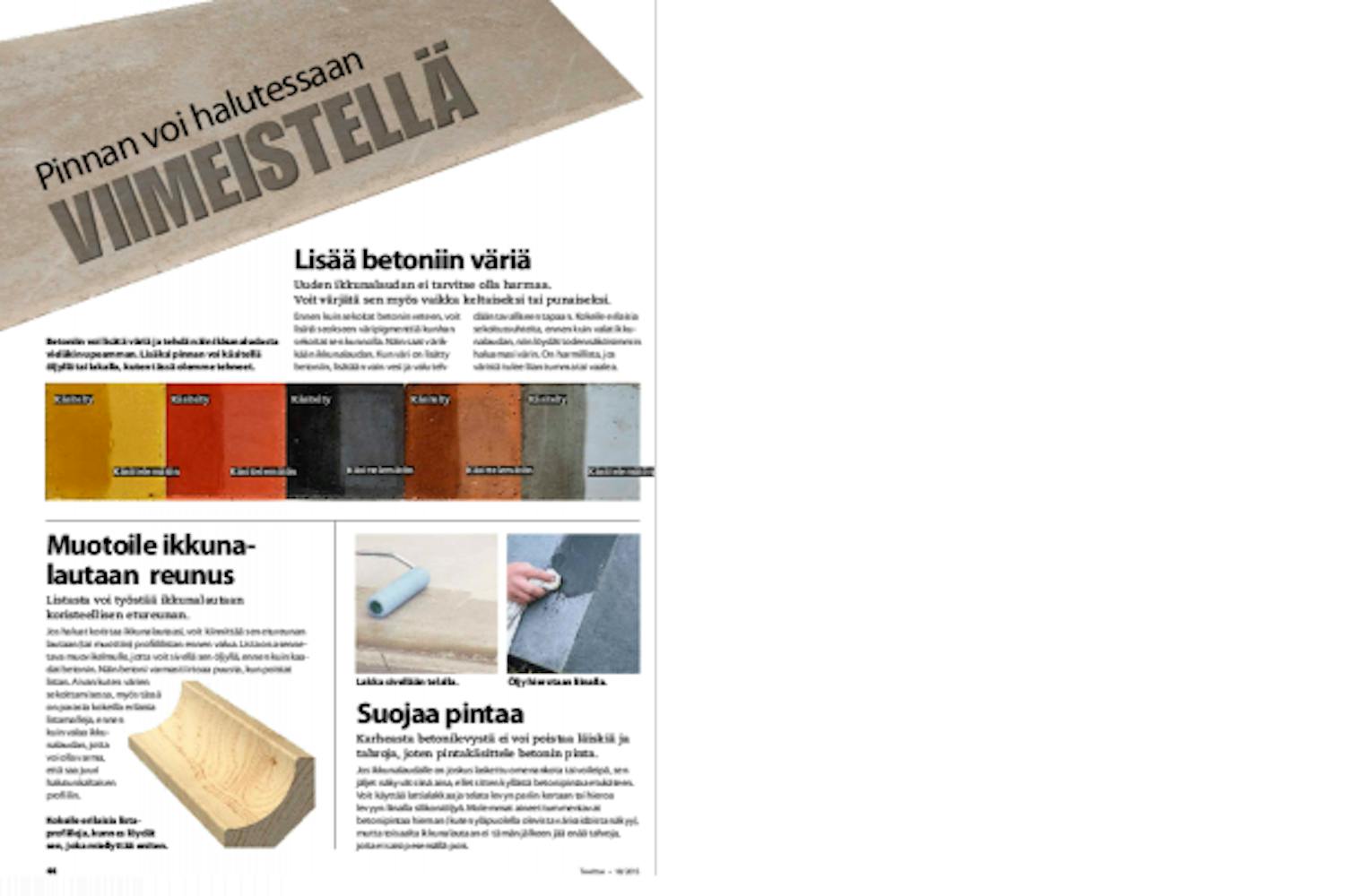 Jos ikkunalaudalle on joskus laskettu omenankota tai voileipä, sen jäljet näkyvät siinä aina, ellet sitten kyllästä betonipintaa etukäteen. Voit käyttää lattialakkaa ja telata levyn pariin kertaan tai hieroa levyyn liinalla silikoniöljyä. Molemmat aineet tummentavat betonipintaa hieman (kuten yläpuolella olevista väriraidoista näkyy), mutta toisaalta ikkunalautaan ei tämän jälkeen jää enää tahroja, joita ei saisi pesemällä pois.