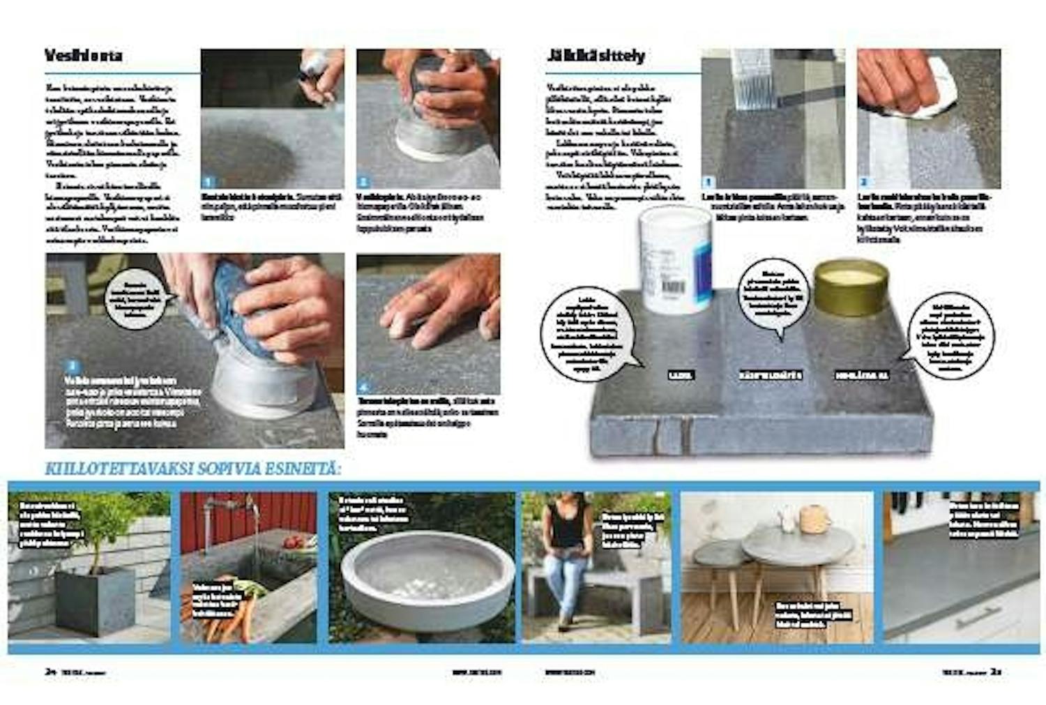 Vesihiottua pintaa ei ole pakko jälkikäsitellä, sillä sileä betoni hylkii likaa varsin hyvin. Pinnasta tulee kuitenkin entistä kestävämpi, jos käsittelet sen vahalla tai lakalla.