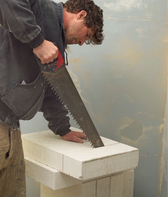 Sahaa harkko kevytbetoni sahalla tai vanhalla käsi sahalla. Kannattaa sahata kaikki harkot yhdellä kertaa, mutta tarkista seinät, kun etenet työssä, sillä seinä saattaa olla jopa 10-12 mm vino.