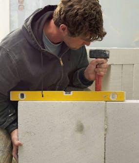 Ensimmäinen harkkorivi on asennettava täysin suoraan joka suunnassa, jotta kevytbeton iseinä seisoo varmasti pysty suorassa.
