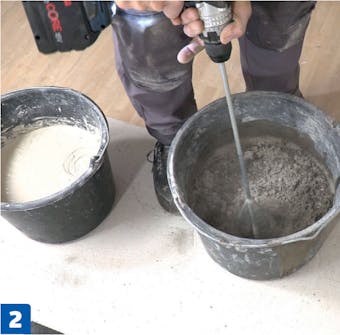 Sekoita laasti ja laattaliima paljuissa säkeissä olevien ohjeiden mukaan. Käytä vispilää ja porakonetta. Kaada paljuun aluksi vettä ja lisää jauhe sen päälle.