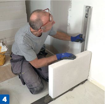 Alimman kerroksen kevytbetonilevyt kiinnitetään lattiaan laastilla. Laastin pitää olla jäykkää, jotta levyt voi säätää vaakasuoraan.