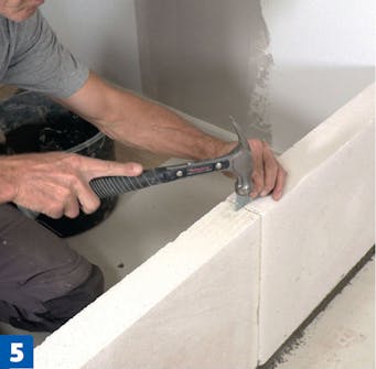 Ahtaaseen koloon tuleva kevytbetonilaatta kannattaa sahata viistosti kahtia ja asentaa kahdessa osassa, jotta liima ei pyyhkiydy pois, kun laatta työnnetään paikalleen.